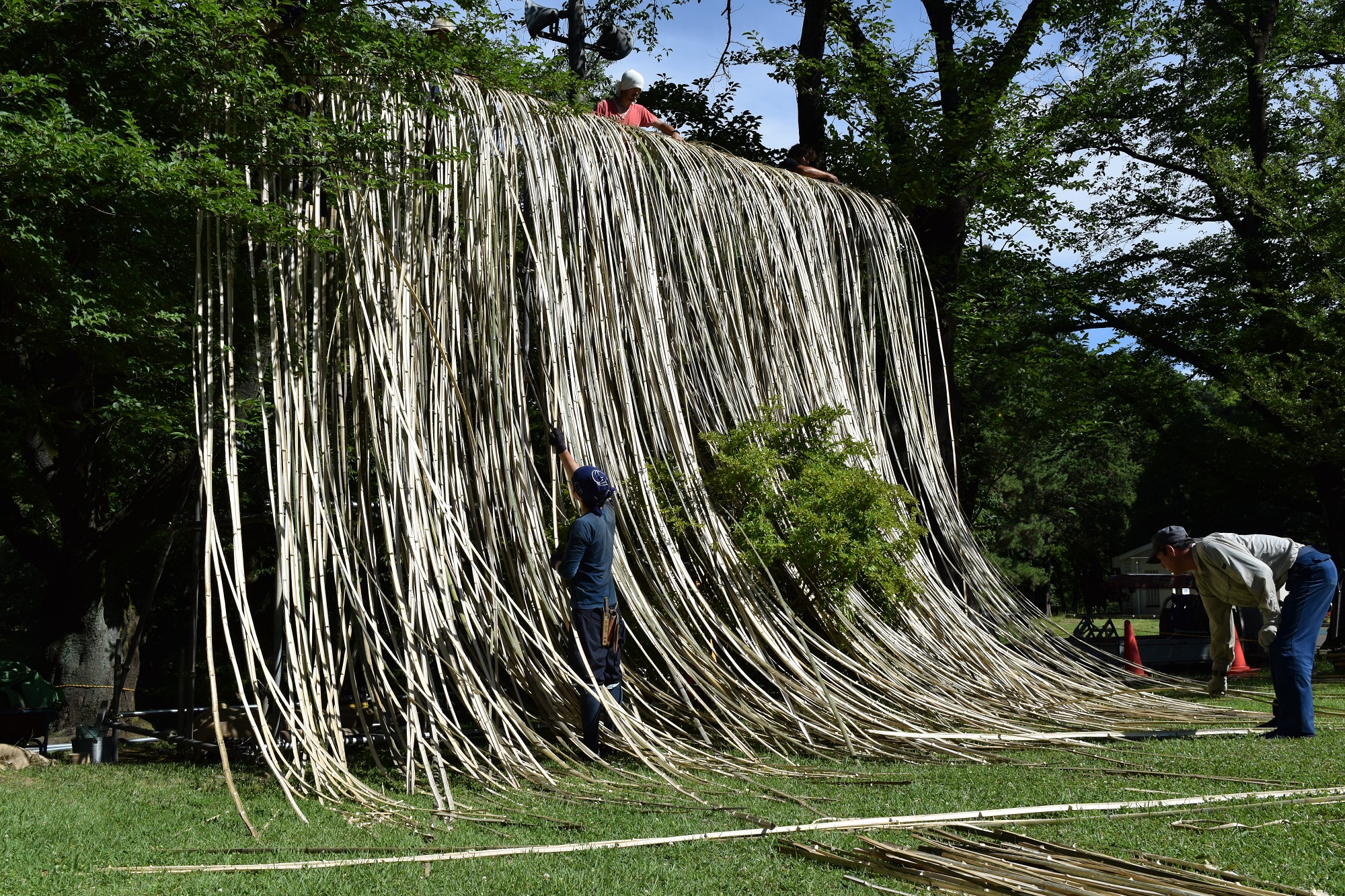 滝の水量を出すために竹を使い、しならせて水の流れ、躍動感を表現しました。