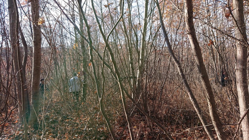 現地に着き、軽トラの荷台に乗り、山の中へ。大北さんもお話していましたが、山採りは山の環境を壊すものだと思っていました。山採り植木には魅了されるものがありますが、現地は一体どうなっているのか、自然を破壊しているのか。実際は写真のように木が混んでいるの中のものを採るもので、山を切り崩したり、はげ山にするわけでもなく、人力と小型ユンボで山の急斜面から植木を掘り運ぶという、とても労力がかかり、山を傷つけないものでした。